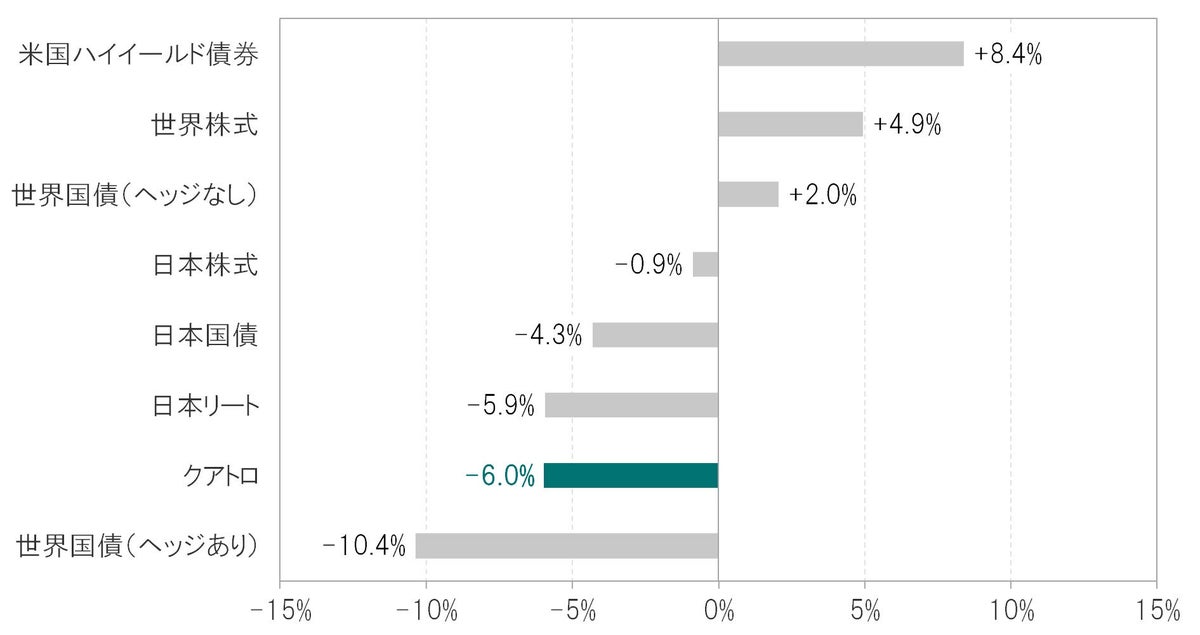 ※日本国債:FTSE日本国債指数、世界国債(ヘッジあり):FTSE世界国債指数(円ヘッジ)、世界国債(ヘッジなし):FTSE世界国債指数(円換算)、米国ハイイールド債券:ICE BofA米国ハイイールド債券指数(円換算)、世界株式:MSCI全世界株価指数(円換算)、日本株式:TOPIX、日本リート:東証REIT指数