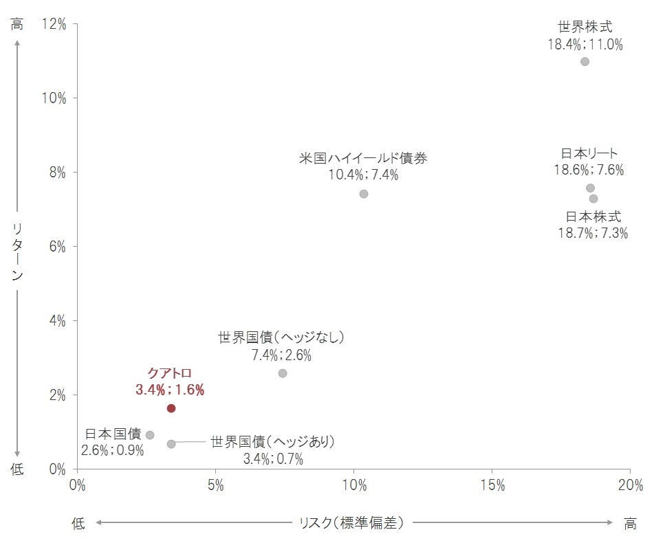 クアトロの設定来の年率のリスク(標準偏差)とリターンはそれぞれ3.4%、1.6%となっています。