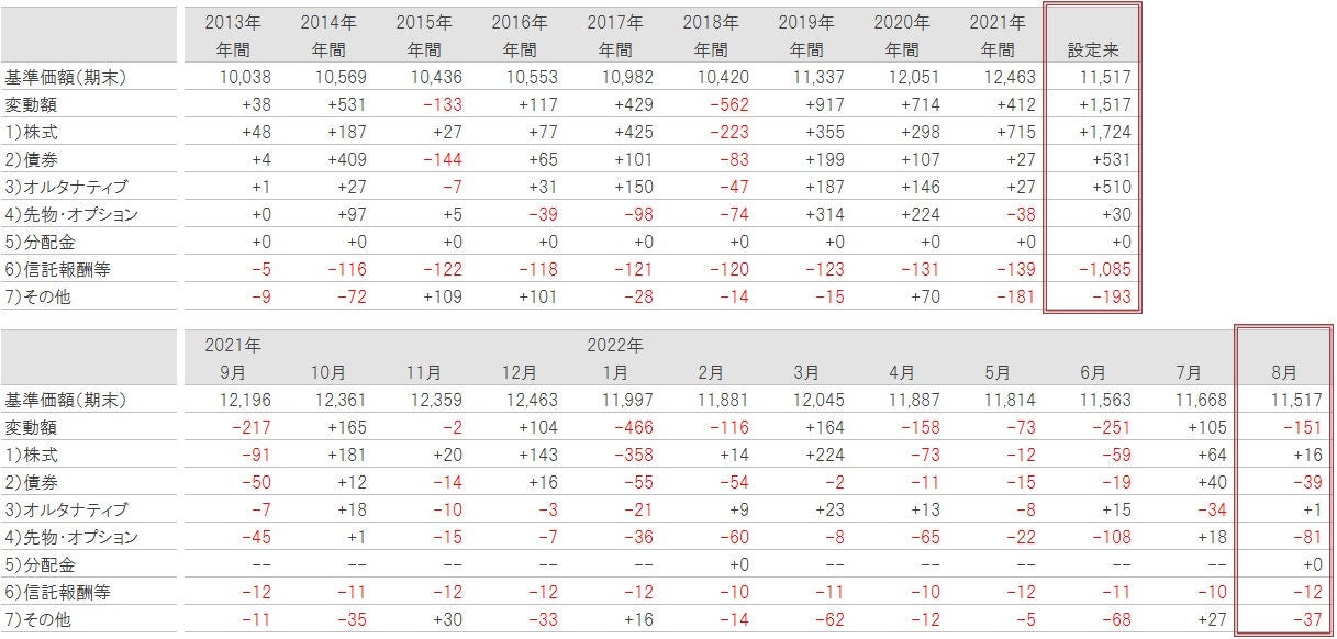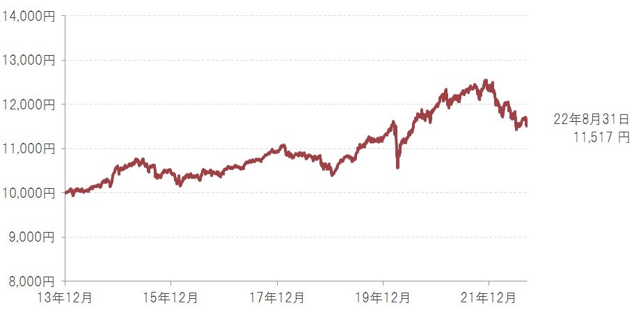 ※上段表の各年間の「基準価額(期末)」は各年末の基準価額を表します。また、各年間の「変動額」は前年末の基準価額に対して各年末の基準価額がどの程度変動したかを表します。なお、「2013年年間」の変動額については設定日(2013年12月12日)の基準価額に対して2013年年末の基準価額がどの程度変動したかを表します。設定来は2013年12月12日~2022年8月31日。