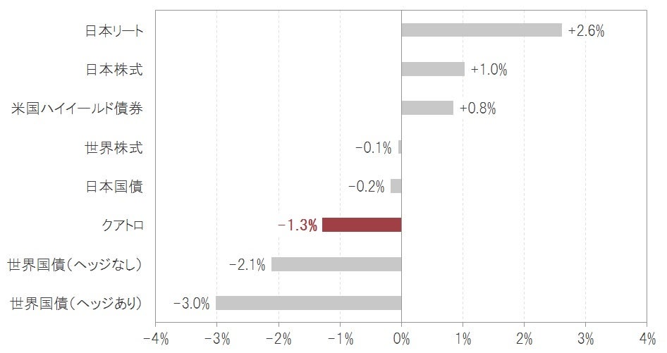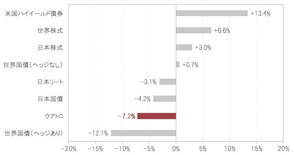 ※日本国債:FTSE日本国債指数、世界国債(ヘッジあり):FTSE世界国債指数(円ヘッジ)、世界国債(ヘッジなし):FTSE世界国債指数(円換算)、米国ハイイールド債券:ICE BofA米国ハイイールド債券指数(円換算)、世界株式:MSCI全世界株価指数(円換算)、日本株式:TOPIX、日本リート:東証REIT指数