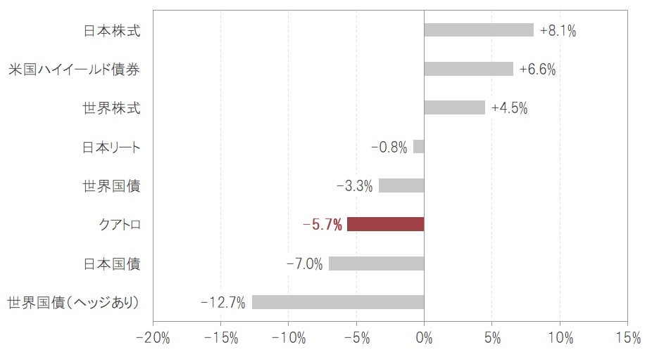 ※日本国債:FTSE日本国債指数、世界国債(ヘッジあり):FTSE世界国債指数(円ヘッジ)、世界国債(ヘッジなし):FTSE世界国債指数(円換算)、米国ハイイールド債券:ICE BofA米国ハイイールド債券指数(円換算)、世界株式:MSCI全世界株価指数(円換算)、日本株式:TOPIX、日本リート:東証REIT指数