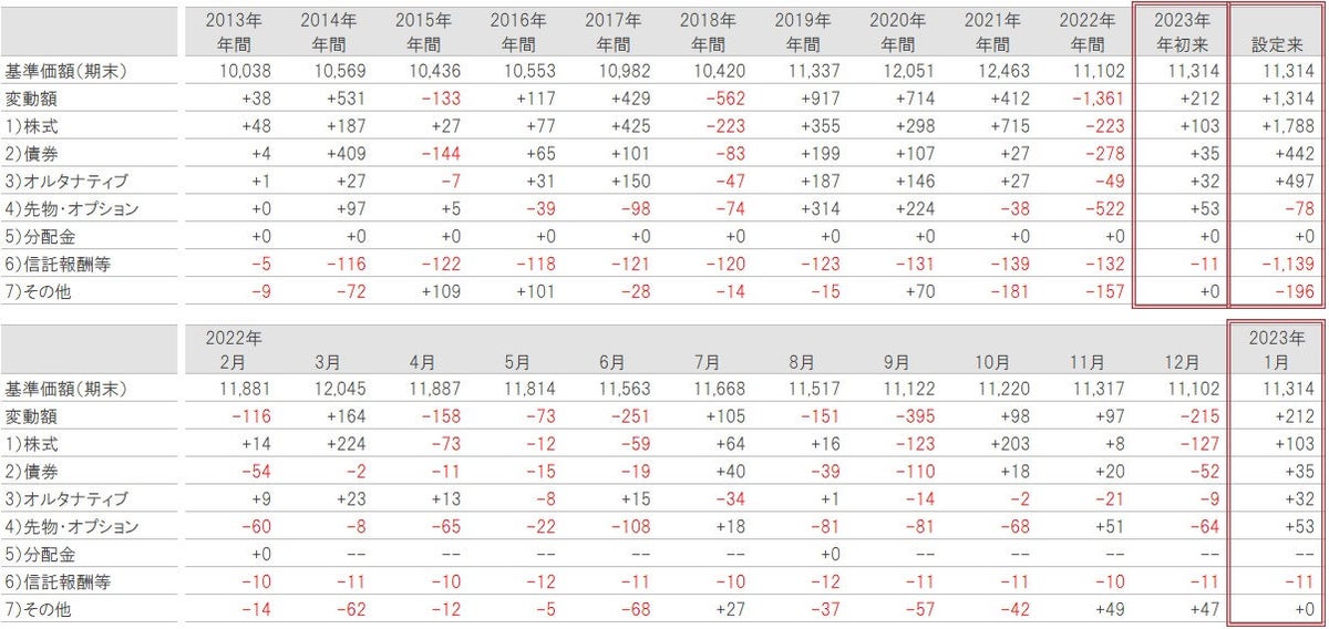 ※上段表の各年間の「基準価額(期末)」は各年末の基準価額を表します。また、各年間の「変動額」は前年末の基準価額に対して各年末の基準価額がどの程度変動したかを表します。なお、「2013年年間」の変動額については設定日(2013年12月12日)の基準価額に対して2013年年末の基準価額がどの程度変動したかを表します。設定来および年初来は2023年1月31日まで。