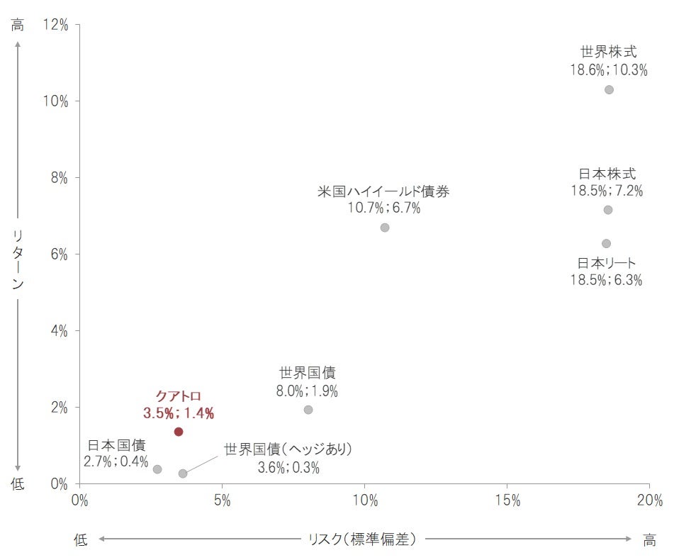 クアトロの設定来の年率のリスク(標準偏差)とリターンはそれぞれ3.5%、1.4%となっています。