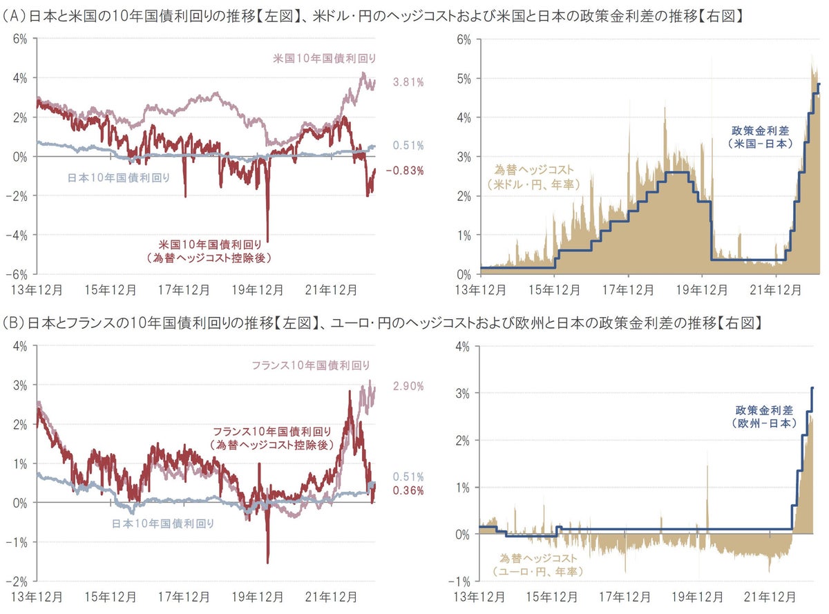 図表4の(A)と(B)の左図にあるように、2023年2月17日時点の10年国債利回りは、米国が3.81%、フランスが2.90%となっており、ともに日本の0.51%に比べて高い水準となっています。一方で、為替ヘッジコスト控除後の10年国債利回りは、米国が-0.83%、フランスが0.36%となり、景色が大きく変わります(米国はマイナスに転じ、フランスも日本の0.51%を下回る水準に)。