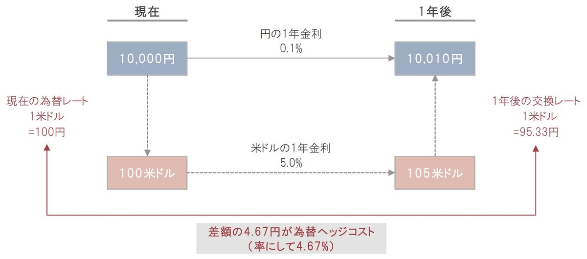 現在の1米ドルを100円、円の1年金利を0.1%、米ドルの1年金利を5.0%とし、手持資金10,000円を米ドルに交換したうえで米ドル預金で1年間運用し、その後、円に換金する場合(費用・税金は考慮せず)を考えます。為替予約により1年後の交換レートをあらかじめ取り決めることで為替変動リスクを抑制することができますが、為替予約を行うには取引相手が必要となります。取引相手はどのような条件であれば取引に応じてくれるでしょうか? 1年後の10,010円(10,000円を金利0.1%で1年間運用)と105米ドル(100米ドルを金利5.0%で1年間運用)が同じ価値となるような交換レートであれば、取引当事者間で有利・不利が生じません。その際の交換レートは1米ドル=95.33円(10,010円÷105米ドル)で、差額の4.67円が為替ヘッジコスト(率にして4.67%)となります。