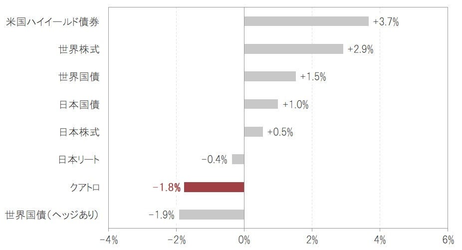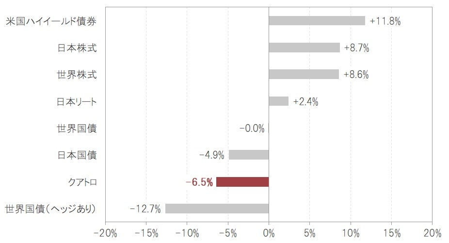 ※日本国債:FTSE日本国債指数、世界国債(ヘッジあり):FTSE世界国債指数(円ヘッジ)、世界国債(ヘッジなし):FTSE世界国債指数(円換算)、米国ハイイールド債券:ICE BofA米国ハイイールド債券指数(円換算)、世界株式:MSCI全世界株価指数(円換算)、日本株式:TOPIX、日本リート:東証REIT指数