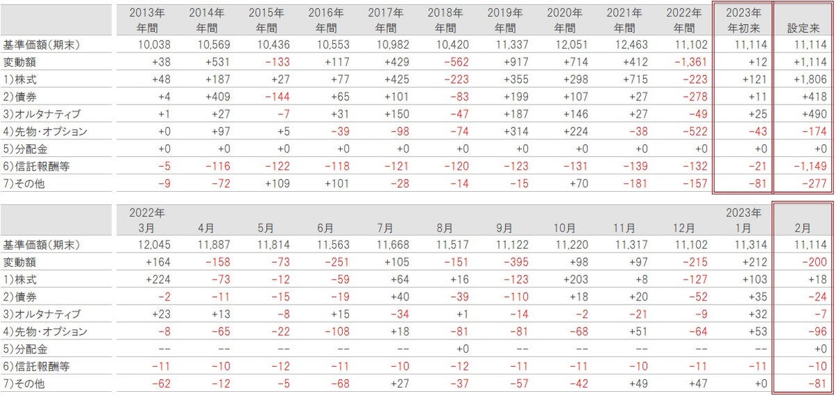 ※上段表の各年間の「基準価額(期末)」は各年末の基準価額を表します。また、各年間の「変動額」は前年末の基準価額に対して各年末の基準価額がどの程度変動したかを表します。なお、「2013年年間」の変動額については設定日(2013年12月12日)の基準価額に対して2013年年末の基準価額がどの程度変動したかを表します。設定来および年初来は2023年2月28日まで。
