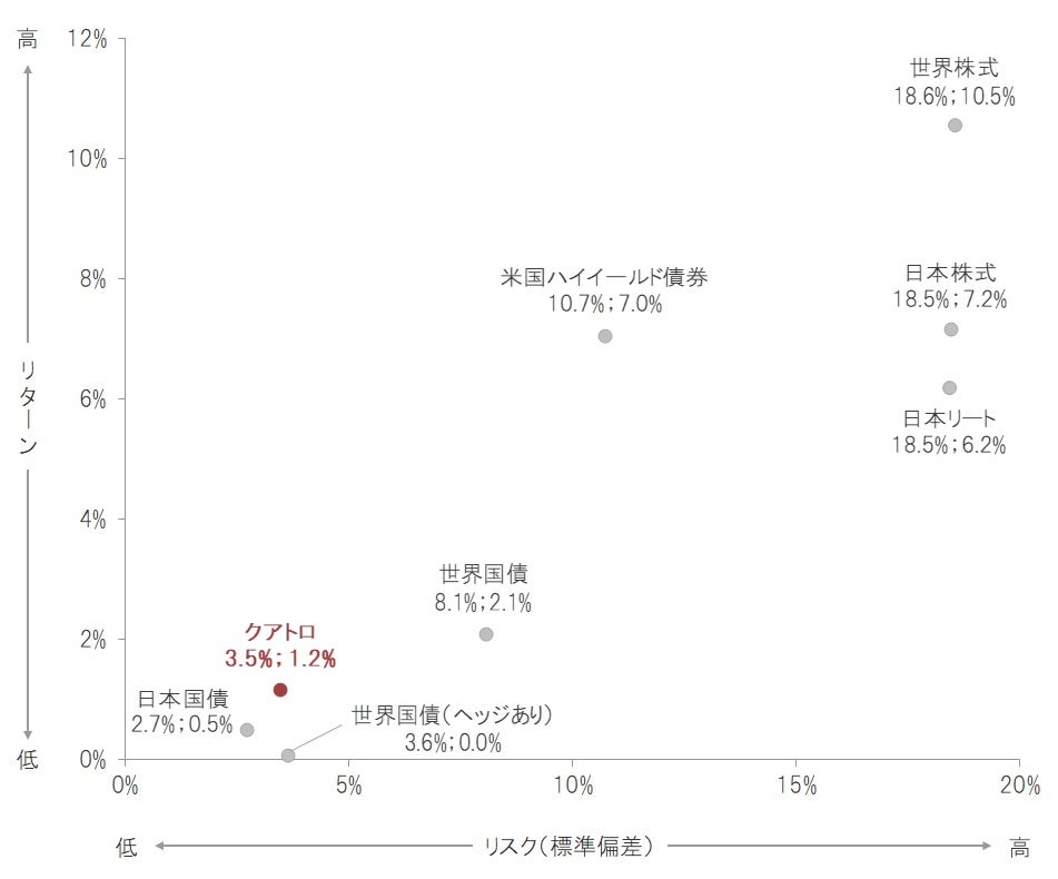 クアトロの設定来の年率のリスク(標準偏差)とリターンはそれぞれ3.5%、1.2%となっています。