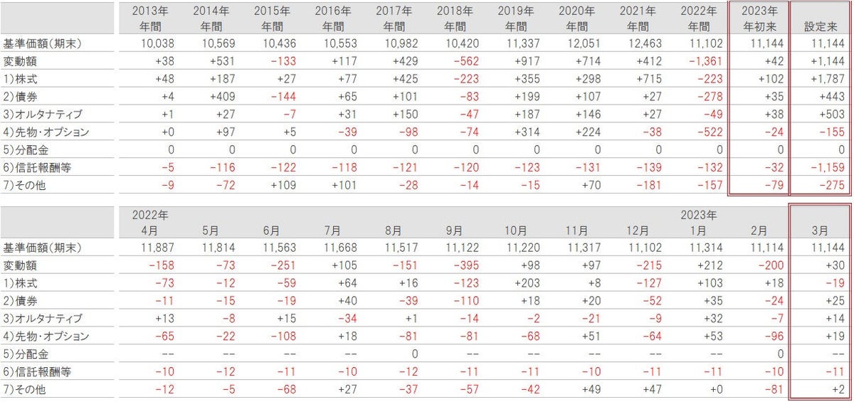 ※上段表の各年間の「基準価額(期末)」は各年末の基準価額を表します。また、各年間の「変動額」は前年末の基準価額に対して各年末の基準価額がどの程度変動したかを表します。なお、「2013年年間」の変動額については設定日(2013年12月12日)の基準価額に対して2013年年末の基準価額がどの程度変動したかを表します。設定来および年初来は2023年3月31日まで。