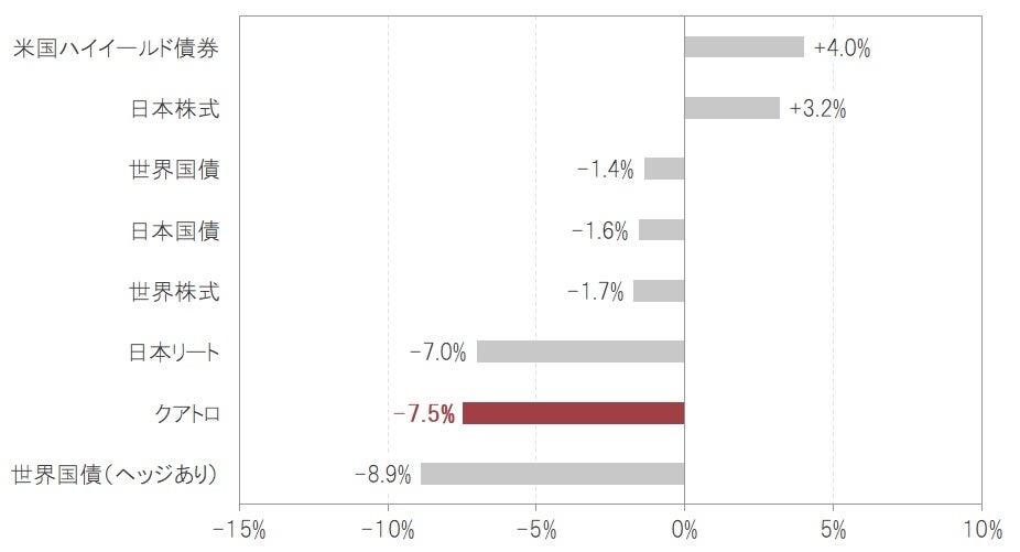 ※日本国債:FTSE日本国債指数、世界国債(ヘッジあり):FTSE世界国債指数(円ヘッジ)、世界国債(ヘッジなし):FTSE世界国債指数(円換算)、米国ハイイールド債券:ICE BofA米国ハイイールド債券指数(円換算)、世界株式:MSCI全世界株価指数(円換算)、日本株式:TOPIX、日本リート:東証REIT指数