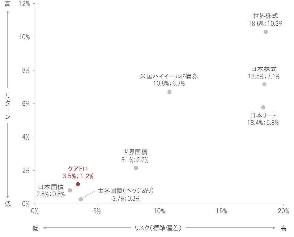 クアトロの設定来の年率のリスク(標準偏差)とリターンはそれぞれ3.5%、1.2%となっています。