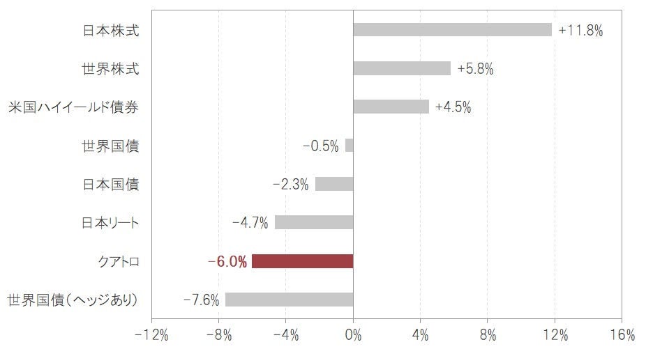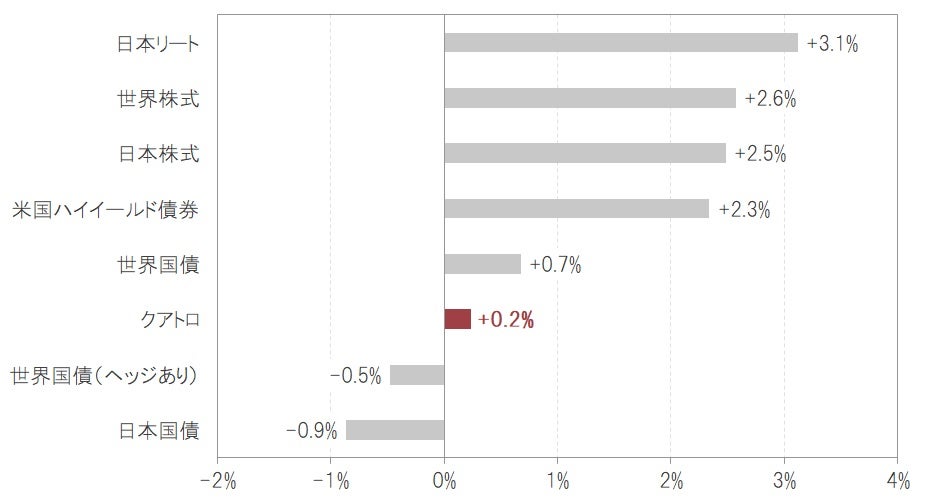 ※日本国債:FTSE日本国債指数、世界国債(ヘッジあり):FTSE世界国債指数(円ヘッジ)、世界国債(ヘッジなし):FTSE世界国債指数(円換算)、米国ハイイールド債券:ICE BofA米国ハイイールド債券指数(円換算)、世界株式:MSCI全世界株価指数(円換算)、日本株式:TOPIX、日本リート:東証REIT指数