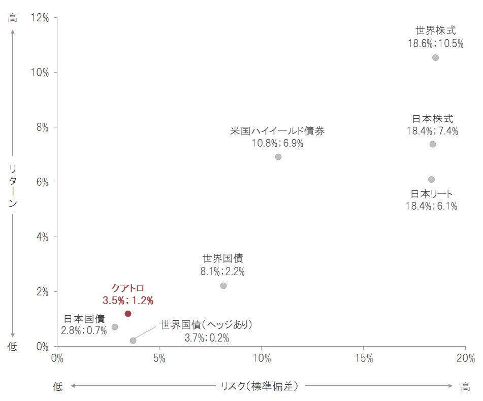 クアトロの設定来の年率のリスク(標準偏差)とリターンはそれぞれ3.5%、1.2%となっています。
