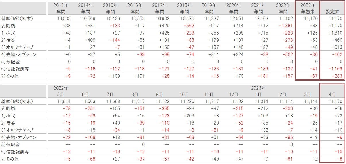 ※上段表の各年間の「基準価額(期末)」は各年末の基準価額を表します。また、各年間の「変動額」は前年末の基準価額に対して各年末の基準価額がどの程度変動したかを表します。なお、「2013年年間」の変動額については設定日(2013年12月12日)の基準価額に対して2013年年末の基準価額がどの程度変動したかを表します。設定来および年初来は2023年4月28日まで。