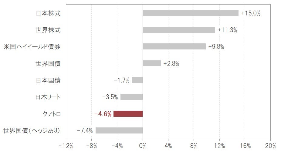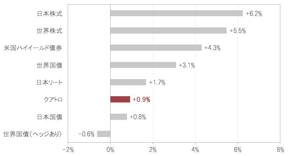 ※日本国債:FTSE日本国債指数、世界国債(ヘッジあり):FTSE世界国債指数(円ヘッジ)、世界国債(ヘッジなし):FTSE世界国債指数(円換算)、米国ハイイールド債券:ICE BofA米国ハイイールド債券指数(円換算)、世界株式:MSCI全世界株価指数(円換算)、日本株式:TOPIX、日本リート:東証REIT指数