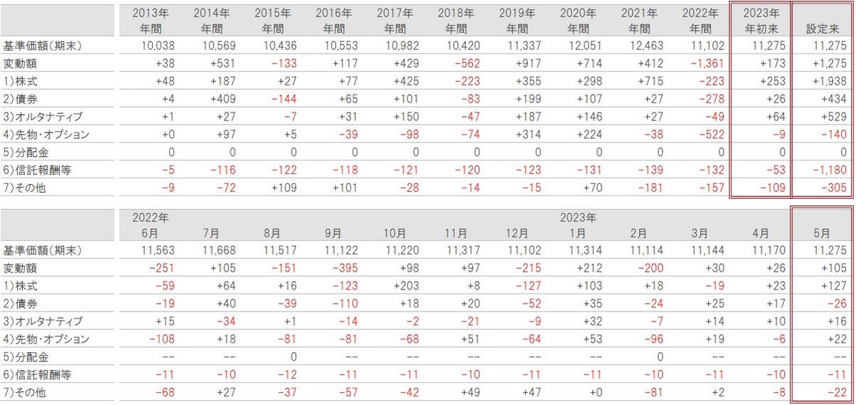 ※上段表の各年間の「基準価額(期末)」は各年末の基準価額を表します。また、各年間の「変動額」は前年末の基準価額に対して各年末の基準価額がどの程度変動したかを表します。なお、「2013年年間」の変動額については設定日(2013年12月12日)の基準価額に対して2013年年末の基準価額がどの程度変動したかを表します。設定来および年初来は2023年5月31日まで。