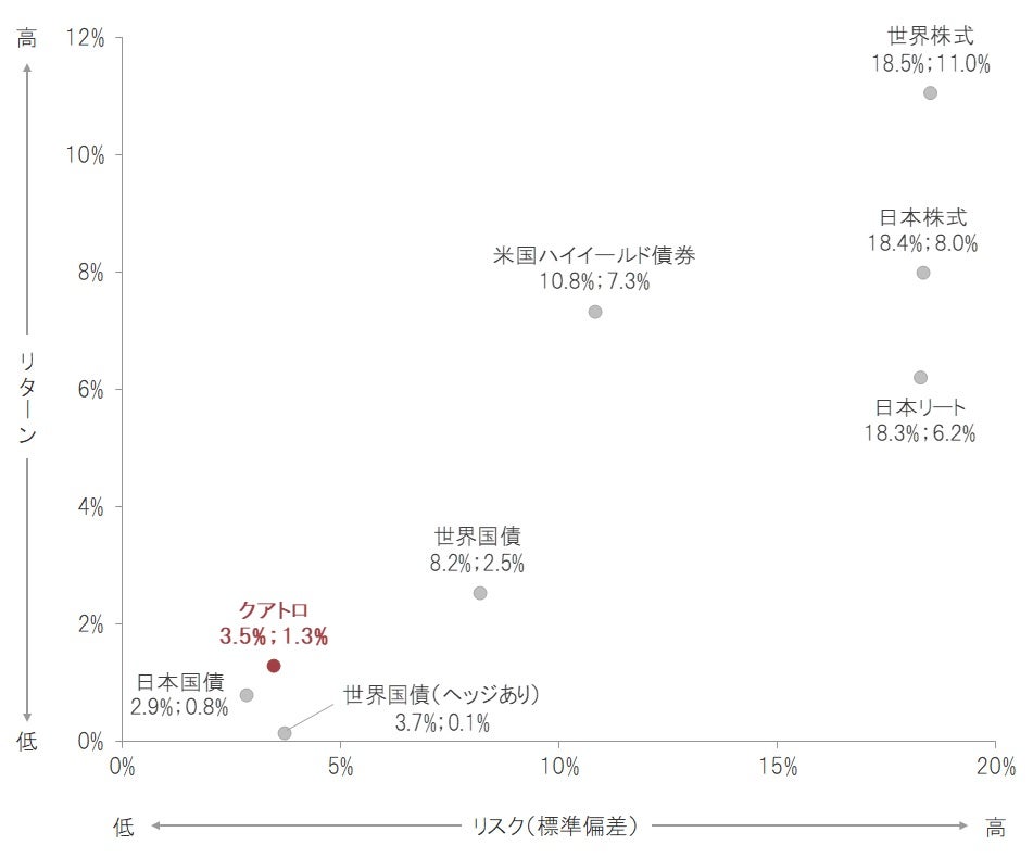クアトロの設定来の年率のリスク(標準偏差)とリターンはそれぞれ3.5%、1.3%となっています。