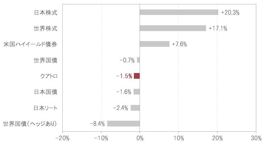 ※日本国債:FTSE日本国債指数、世界国債(ヘッジあり):FTSE世界国債指数(円ヘッジ)、世界国債(ヘッジなし):FTSE世界国債指数(円換算)、米国ハイイールド債券:ICE BofA米国ハイイールド債券指数(円換算)、世界株式:MSCI全世界株価指数(円換算)、日本株式:TOPIX、日本リート:東証REIT指数