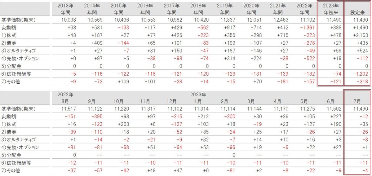 ※上段表の各年間の「基準価額(期末)」は各年末の基準価額を表します。また、各年間の「変動額」は前年末の基準価額に対して各年末の基準価額がどの程度変動したかを表します。なお、「2013年年間」の変動額については設定日(2013年12月12日)の基準価額に対して2013年年末の基準価額がどの程度変動したかを表します。設定来および年初来は2023年7月31日まで。