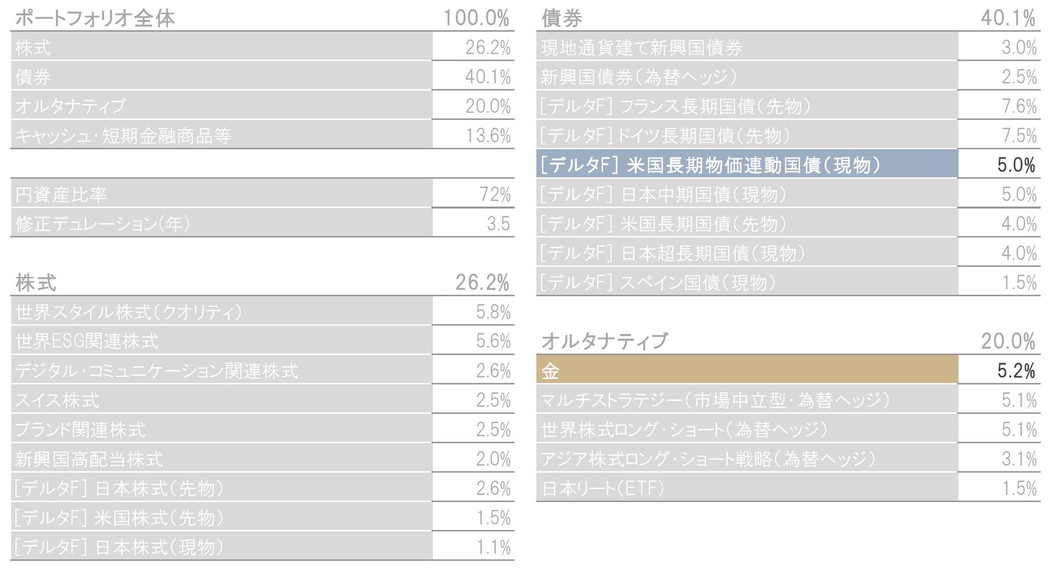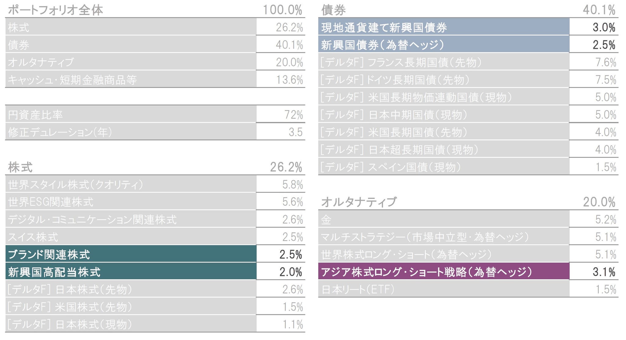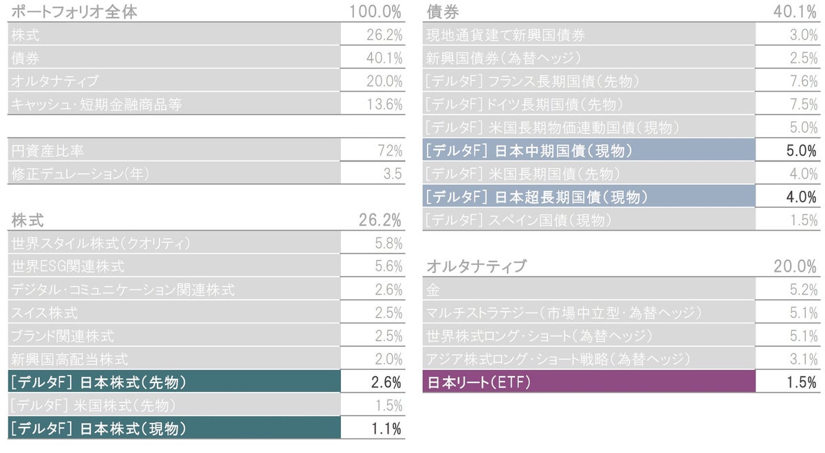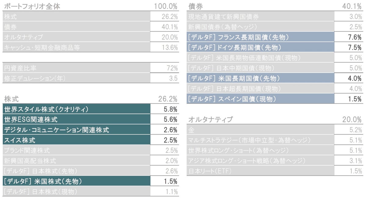 ※構成比は実質比率(マザーファンドの組入比率×マザーファンドにおける当該資産の組入比率)です。マザーファンドにおける当該資産の組入比率は、各投資先ファンドを主な投資対象によって株式、債券、オルタナティブ、短期金融商品等に分類、集計しています。株式と債券の構成比には、マザーファンドの投資先ファンドであるピクテ・デルタ・ファンドの株式、債券、株式先物、債券先物、オプションプレミアムを含めて集計しています。キャッシュ・短期金融商品等には投資先ファンドで保有する現金等の比率を含みません。 ※円資産比率は、当ファンドで保有しているコール・ローン等の比率、円建て資産の比率、為替予約の比率から計算した概算値です。 ※修正デュレーションは、月末時点のウェイト加重平均修正デュレーション(当ファンドに占める債券のウェイト×債券ポートフォリオの修正デュレーション)で、概算値です。 ※[デルタF]で始まる資産は、ピクテ・デルタ・ファンドを通じて投資している株式の現物、先物、オプションプレミアムおよび債券の現物、先物、オプションプレミアムです。