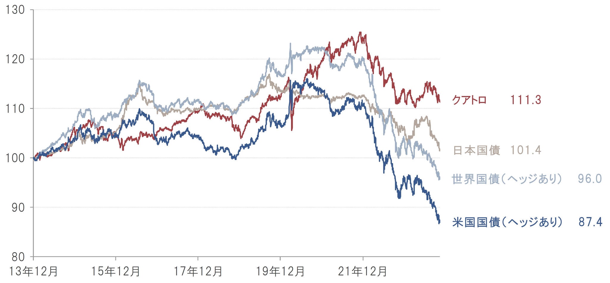 クアトロの基準価額は、設定来(2013年12月12日~2023年10月27日、以下同様)で、11.3%の上昇となっています(図表2)。一方、比較対象となる代表的な低リスク資産の騰落率は、同期間に、日本国債が+1.4%、世界国債(ヘッジあり)が-4.0%、米国国債(ヘッジあり)が-12.6%などとなっています。