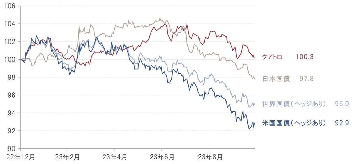 ● クアトロの2023年年初来の基準価額の騰落率は+0.3%。年前半は分散効果の復活を背景に堅調に推移した一方、7月以降は世界的に金利が上昇するなかで低調に推移。