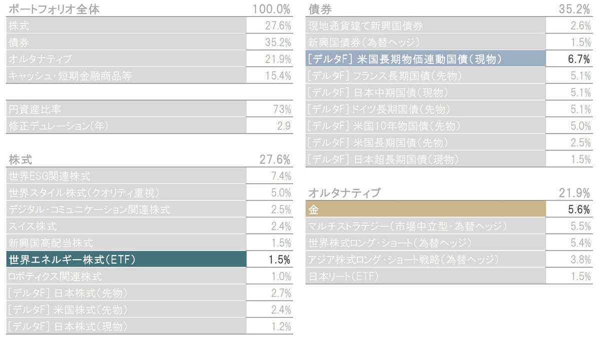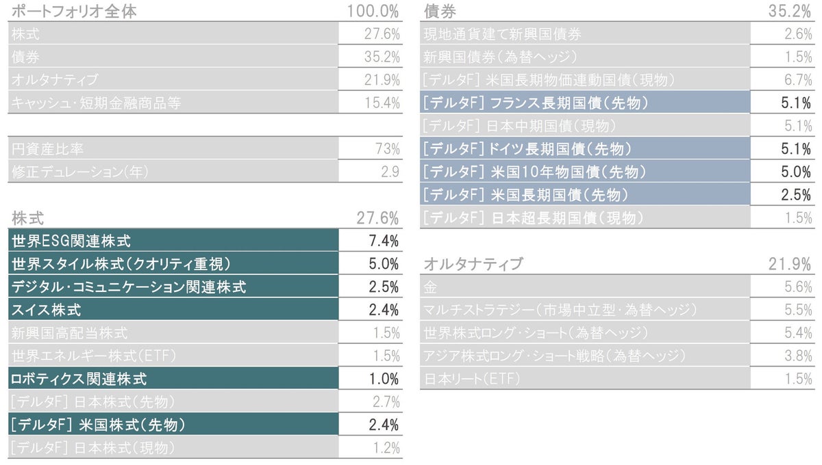 ※構成比は実質比率(マザーファンドの組入比率×マザーファンドにおける当該資産の組入比率)です。マザーファンドにおける当該資産の組入比率は、各投資先ファンドを主な投資対象によって株式、債券、オルタナティブ、短期金融商品等に分類、集計しています。株式と債券の構成比には、マザーファンドの投資先ファンドであるピクテ・デルタ・ファンドの株式、債券、株式先物、債券先物、オプションプレミアムを含めて集計しています。キャッシュ・短期金融商品等には投資先ファンドで保有する現金等の比率を含みません。※円資産比率は、当ファンドで保有しているコール・ローン等の比率、円建て資産の比率、為替予約の比率から計算した概算値です。※修正デュレーションは、月末時点のウェイト加重平均修正デュレーション(当ファンドに占める債券のウェイト×債券ポートフォリオの修正デュレーション)で、概算値です。※[デルタF]で始まる資産は、ピクテ・デルタ・ファンドを通じて投資している株式の現物、先物、オプションプレミアムおよび債券の現物、先物、オプションプレミアムです。