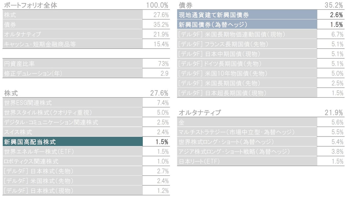 2023年10月末時点のポートフォリオの構成比は、株式27.6%、債券35.2%、オルタナティブ21.9%、キャッシュ・短期金融商品等15.4%となっています(図表1)。