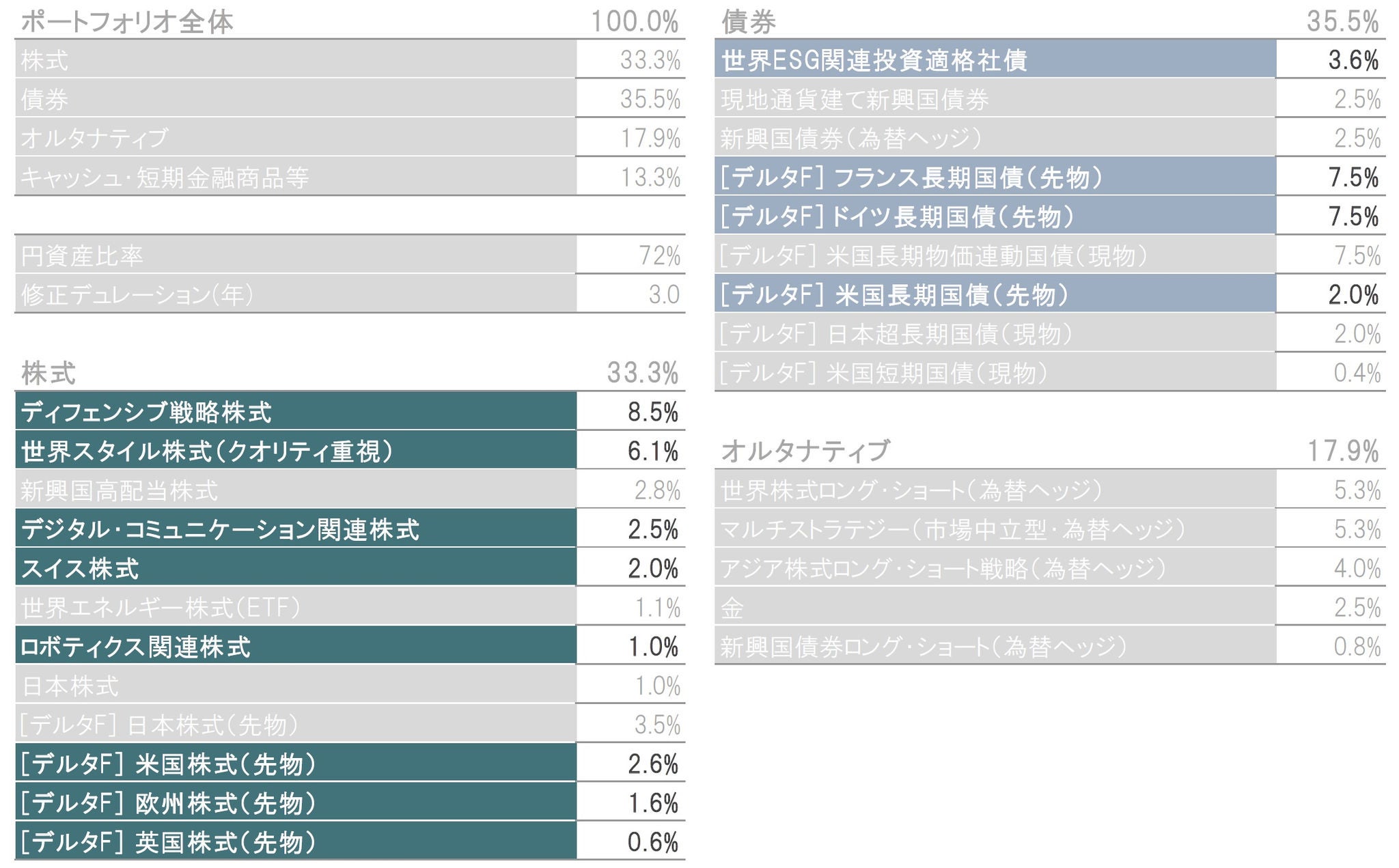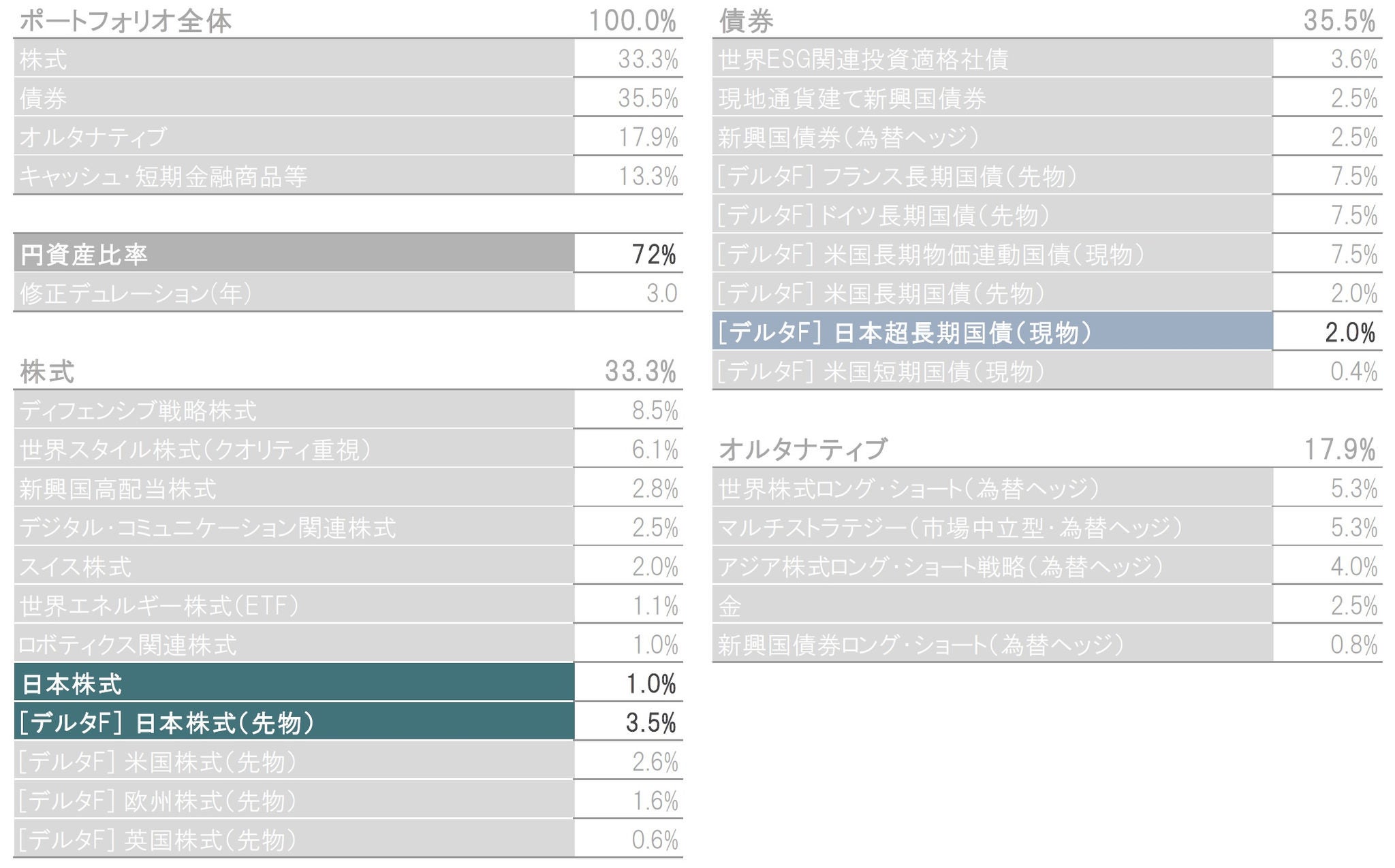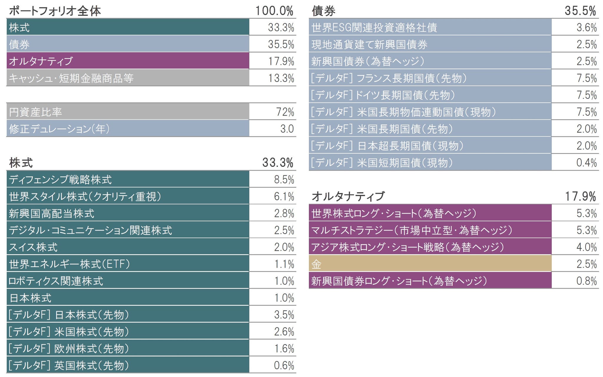 ※構成比は実質比率(マザーファンドの組入比率×マザーファンドにおける当該資産の組入比率)です。マザーファンドにおける当該資産の組入比率は、各投資先ファンドを主な投資対象によって株式、債券、オルタナティブ、短期金融商品等に分類、集計しています。株式と債券の構成比には、マザーファンドの投資先ファンドであるピクテ・デルタ・ファンドの株式、債券、株式先物、債券先物、オプションプレミアムを含めて集計しています。キャッシュ・短期金融商品等には投資先ファンドで保有する現金等の比率を含みません。 ※円資産比率は、当ファンドで保有しているコール・ローン等の比率、円建て資産の比率、為替予約の比率から計算した概算値です。 ※修正デュレーションは、月末時点のウェイト加重平均修正デュレーション(当ファンドに占める債券のウェイト×債券ポートフォリオの修正デュレーション)で、概算値です。 ※[デルタF]で始まる資産は、ピクテ・デルタ・ファンドを通じて投資している株式の現物、先物、オプションプレミアムおよび債券の現物、先物、オプションプレミアムです。