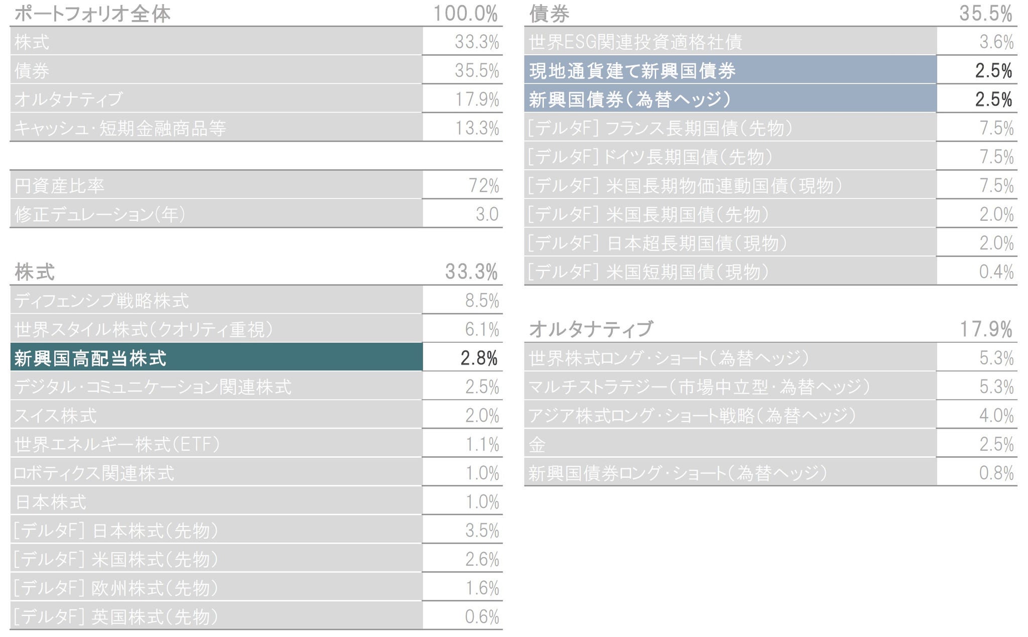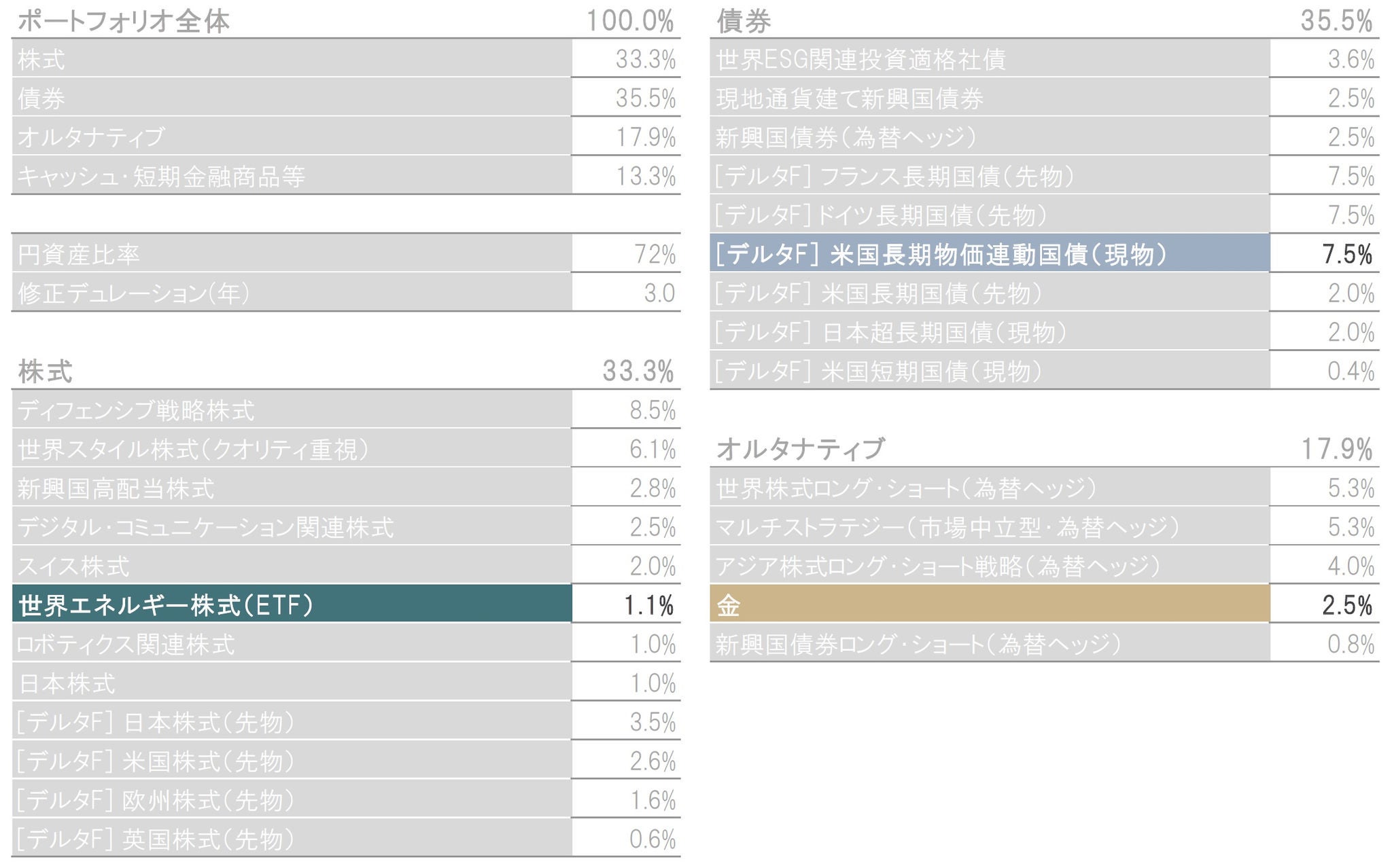 オルタナティブでは、ポートフォリオ分散の観点からロング・ショート型戦略、市場中立型戦略、金への投資を継続しています。金については、中長期での強気見通しは変わらないものの、目標とする価格水準に迫る上昇となったことからいったん組入比率を引き下げました。