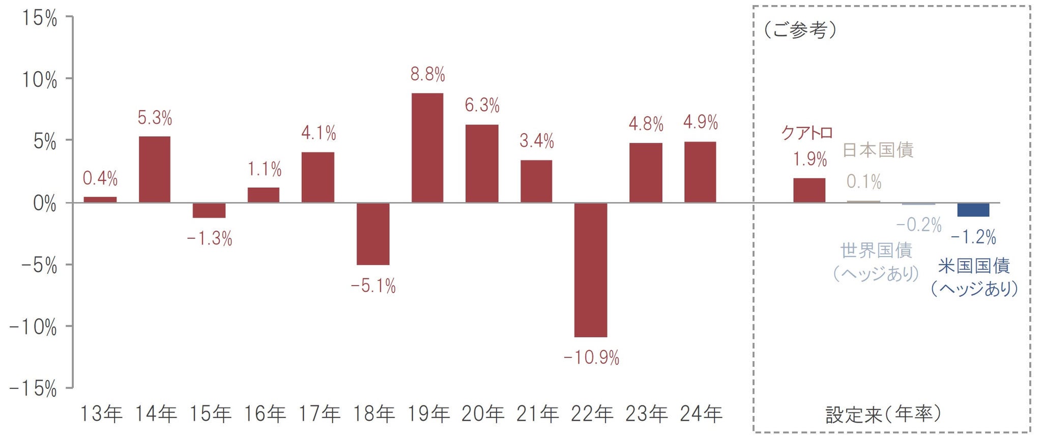 ※基準価額は信託報酬等控除後。換金時の費用・税金等は考慮しておりません。 ※2013年は2013年12月12日(設定日)~2013年12月30日の騰落率を示しています。 ※日本国債:FTSE日本国債指数、世界国債(ヘッジあり):FTSE世界国債指数(円ヘッジ)、米国国債(ヘッジあり):FTSE米国国債指数(円ヘッジ) ※指数はすべてトータル・リターン・ベース※投資対象ファンドによって基準価額に反映する日が1-2日異なるため、比較指数は1営業日前ベースとしています。