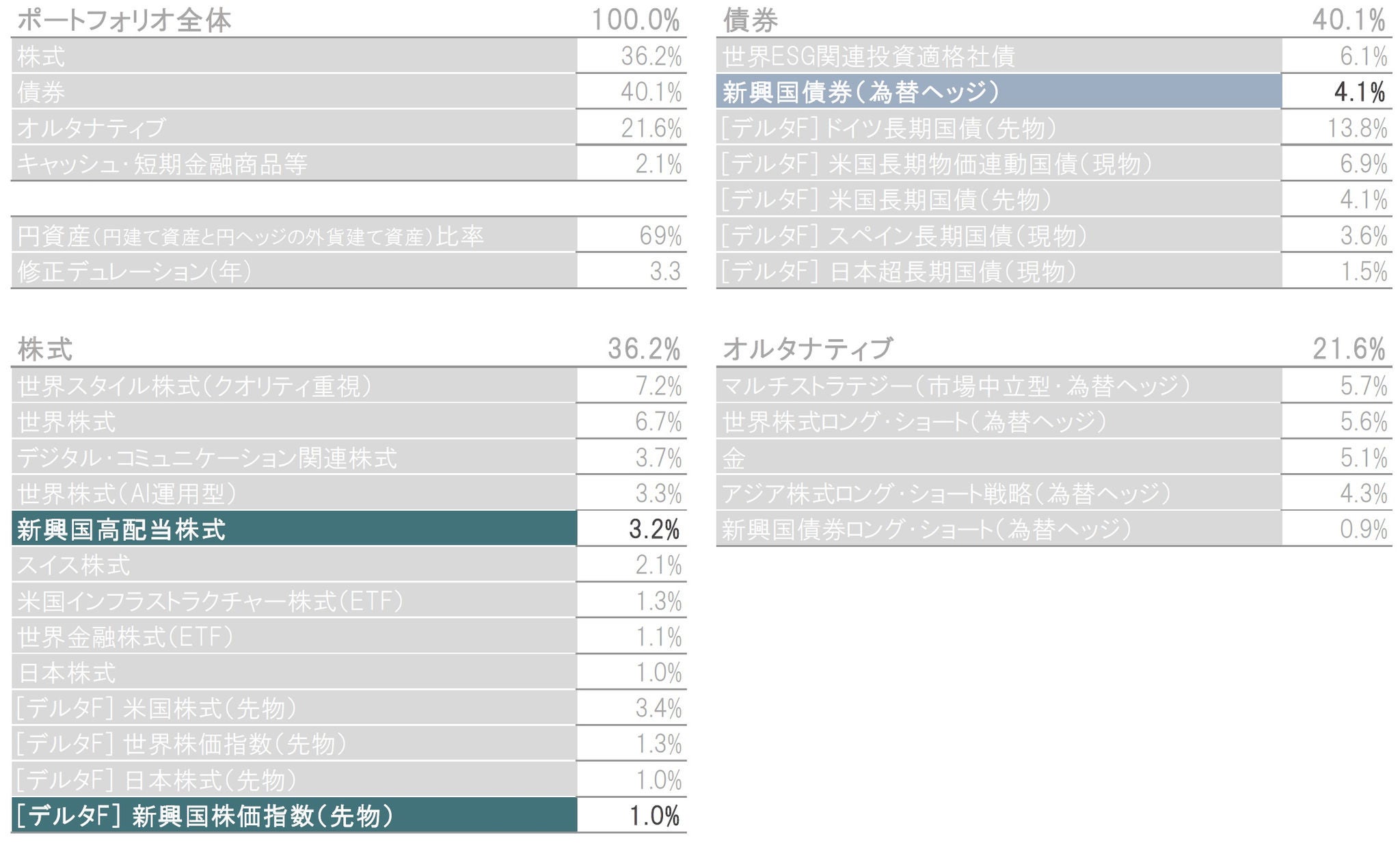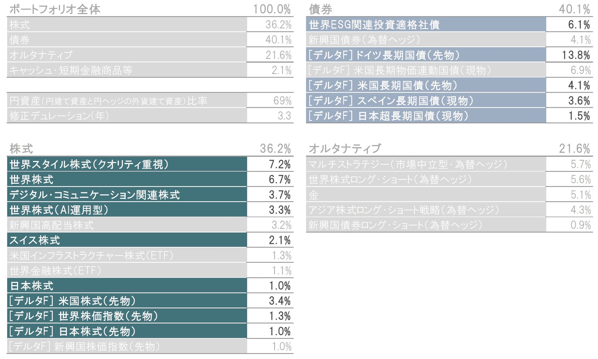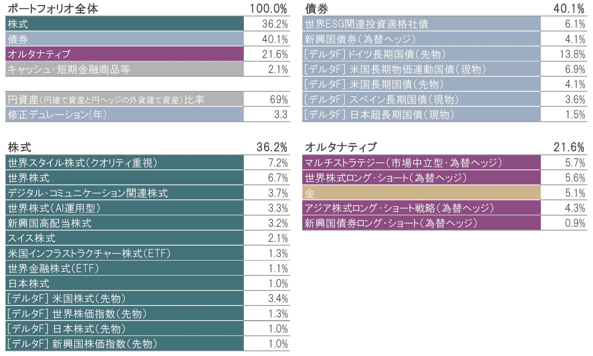 ※構成比は実質比率(マザーファンドの組入比率×マザーファンドにおける当該資産の組入比率)です。マザーファンドにおける当該資産の組入比率は、各投資先ファンドを主な投資対象によって株式、債券、オルタナティブ、短期金融商品等に分類、集計しています。株式と債券の構成比には、マザーファンドの投資先ファンドであるピクテ・デルタ・ファンドの株式、債券、株式先物、債券先物、オプションプレミアムを含めて集計しています。キャッシュ・短期金融商品等には投資先ファンドで保有する現金等の比率を含みません。 ※円資産比率は円建て資産と円ヘッジの外貨建て資産の合計で、概算値です。 ※修正デュレーションは、月末時点のウェイト加重平均修正デュレーション(当ファンドに占める債券のウェイト×債券ポートフォリオの修正デュレーション)で、概算値です。 ※[デルタF]で始まる資産は、ピクテ・デルタ・ファンドを通じて投資している株式の現物、先物、オプションプレミアムおよび債券の現物、先物、オプションプレミアムです。