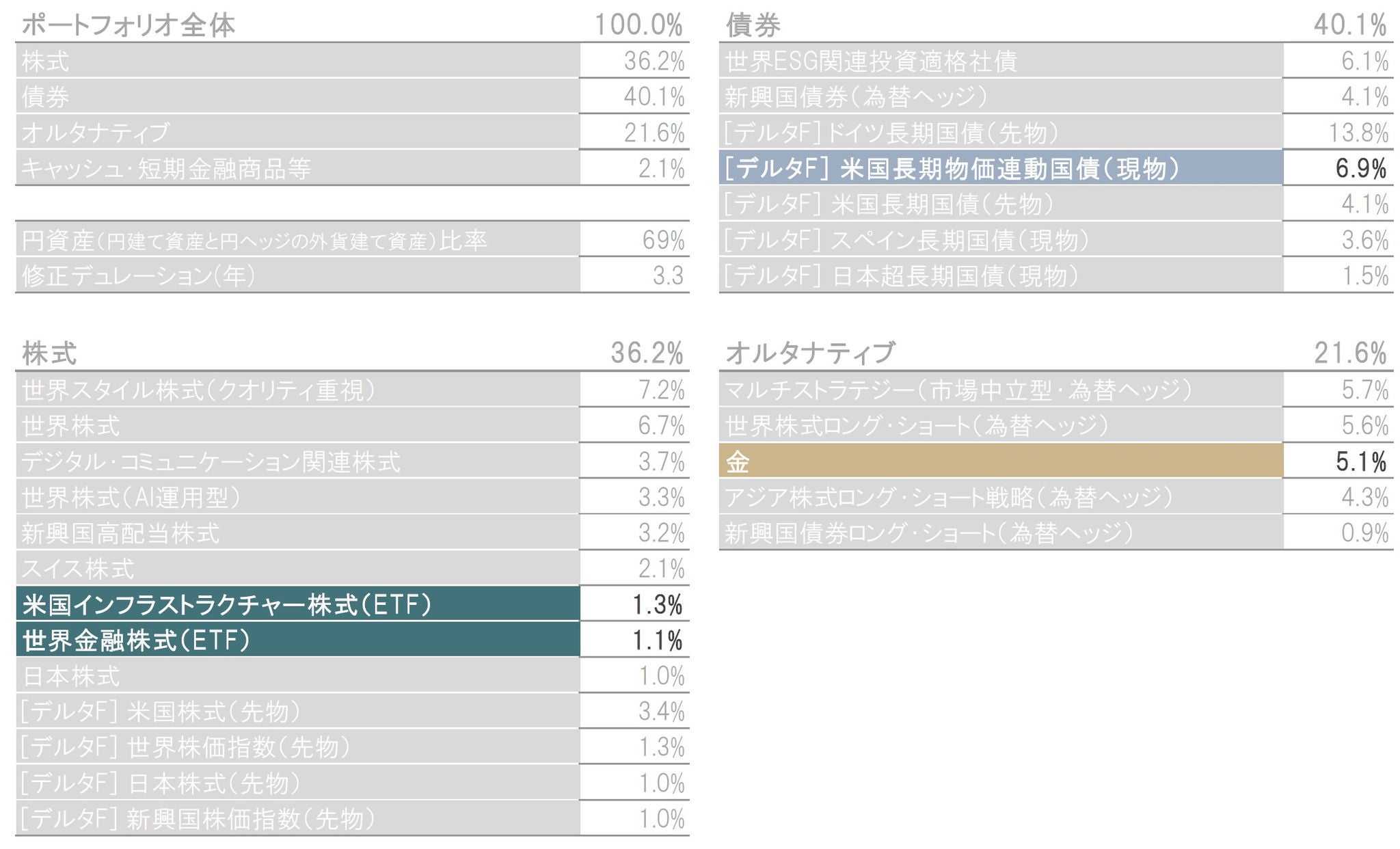 オルタナティブでは、ポートフォリオ分散の観点から市場中立型戦略、ロング・ショート型戦略、金への投資を継続しています。金については、①インフレ耐性、②地政学的リスクを背景に底堅い需要が見込まれる点、などを前向きに評価しており、中長期での強気スタンスを継続します。