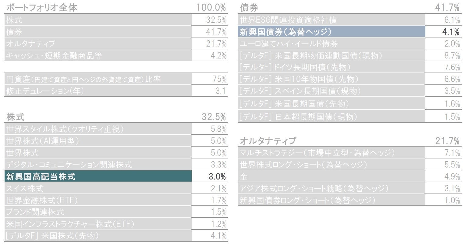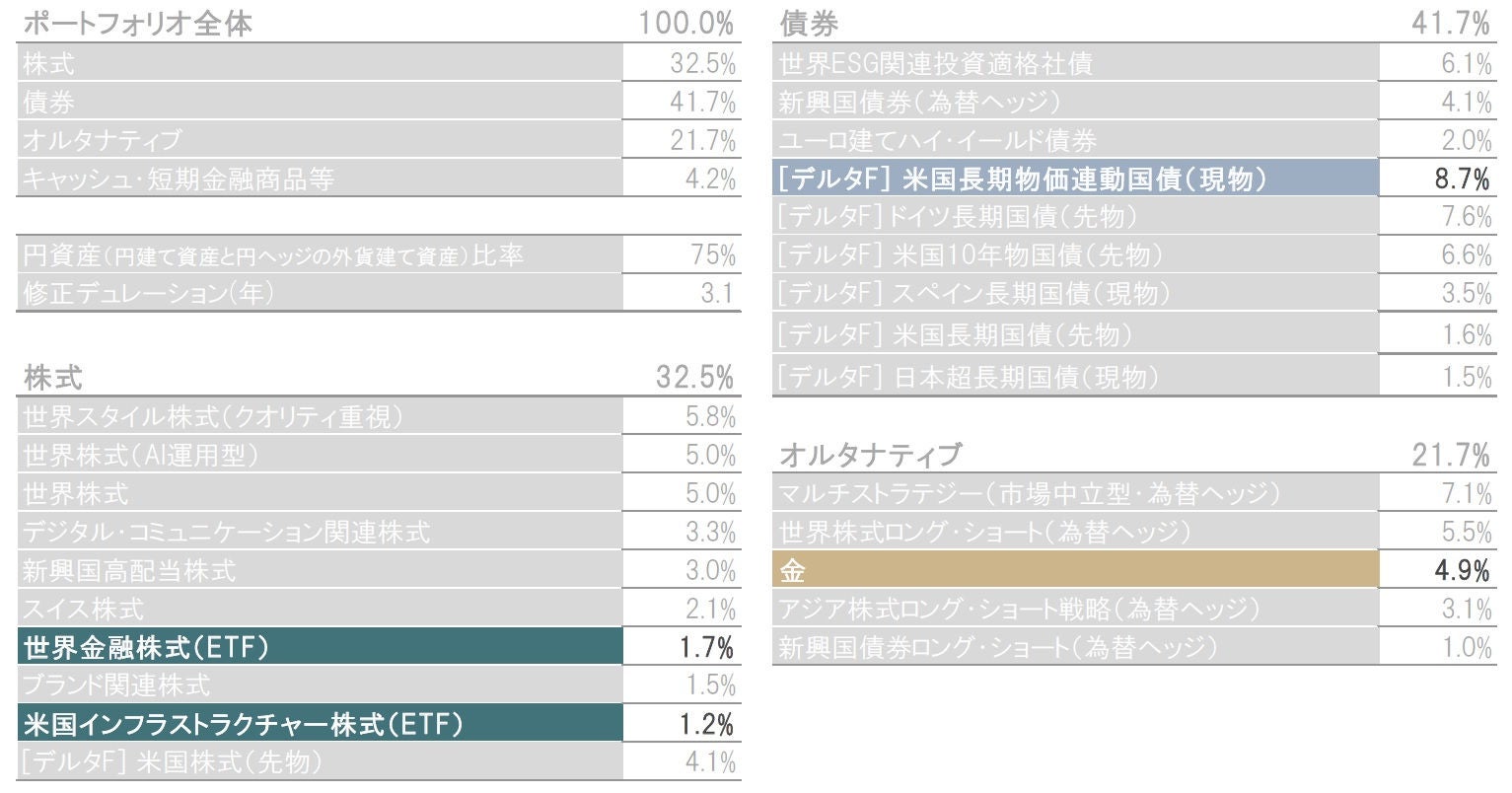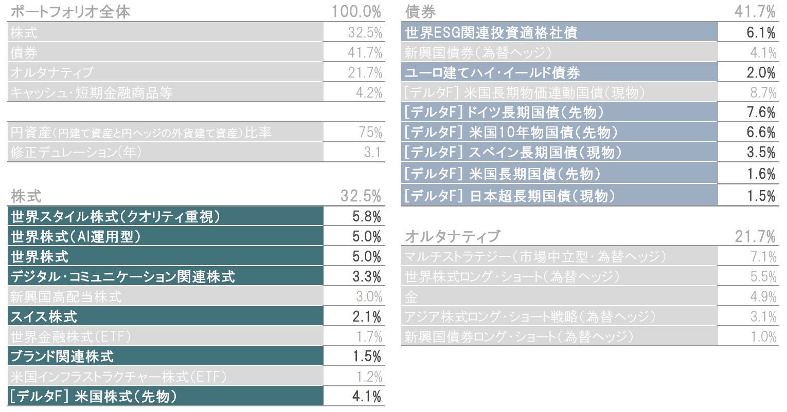 ※構成比は実質比率(マザーファンドの組入比率×マザーファンドにおける当該資産の組入比率)です。マザーファンドにおける当該資産の組入比率は、各投資先ファンドを主な投資対象によって株式、債券、オルタナティブ、短期金融商品等に分類、集計しています。株式と債券の構成比には、マザーファンドの投資先ファンドであるピクテ・デルタ・ファンドの株式、債券、株式先物、債券先物、オプションプレミアムを含めて集計しています。キャッシュ・短期金融商品等には投資先ファンドで保有する現金等の比率を含みません。 ※円資産比率は円建て資産と円ヘッジの外貨建て資産の合計で、概算値です。 ※修正デュレーションは、月末時点のウェイト加重平均修正デュレーション(当ファンドに占める債券のウェイト×債券ポートフォリオの修正デュレーション)で、概算値です。 ※[デルタF]で始まる資産は、ピクテ・デルタ・ファンドを通じて投資している株式の現物、先物、オプションプレミアムおよび債券の現物、先物、オプションプレミアムです。