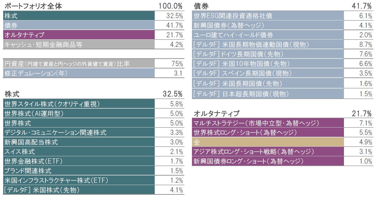2025年2月末時点のポートフォリオの構成比は、株式が32.5%、債券が41.7%、オルタナティブが21.7%、キャッシュ・短期金融商品等が4.2%となっています(図表3)。