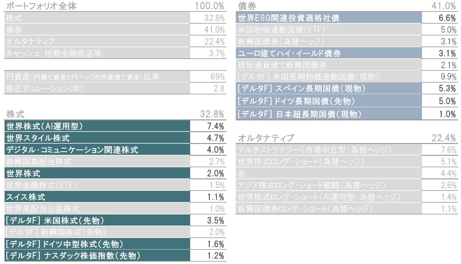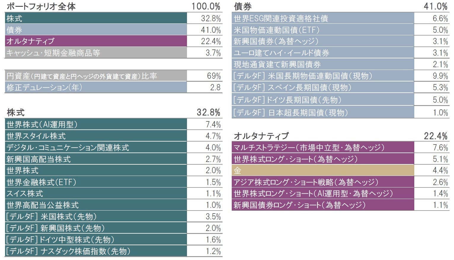 ※構成比は実質比率(マザーファンドの組入比率×マザーファンドにおける当該資産の組入比率)です。マザーファンドにおける当該資産の組入比率は、各投資先ファンドを主な投資対象によって株式、債券、オルタナティブ、短期金融商品等に分類、集計しています。株式と債券の構成比には、マザーファンドの投資先ファンドであるピクテ・デルタ・ファンドの株式、債券、株式先物、債券先物、オプションプレミアムを含めて集計しています。キャッシュ・短期金融商品等には投資先ファンドで保有する現金等の比率を含みません。 ※円資産比率は円建て資産と円ヘッジの外貨建て資産の合計で、概算値です。 ※修正デュレーションは、月末時点のウェイト加重平均修正デュレーション(当ファンドに占める債券のウェイト×債券ポートフォリオの修正デュレーション)で、概算値です。 ※[デルタF]で始まる資産は、ピクテ・デルタ・ファンドを通じて投資している株式の現物、先物、オプションプレミアムおよび債券の現物、先物、オプションプレミアムです。