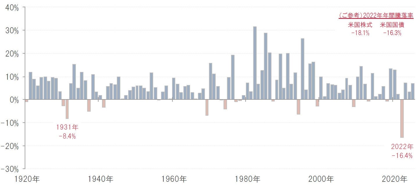 「低リスク型分散投資ポートフォリオ」の1920年から2025年までの106年分の年間騰落率(2025年は8月末まで)を振り返ると、2022年が百年に一度とも言える未曾有の年であったことがわかります。2022年は世界的なインフレの高進とそれに対する米連邦準備制度理事会(FRB)をはじめとした主要中央銀行による急速な金融引き締めの動きがあり、市場は、大規模な金融緩和によって支えられたそれまでとは異なる状況に直面しました。そうしたなか、株式市場と債券市場が揃って大きく下落した2022年の「低リスク型分散投資ポートフォリオ」の年間騰落率は-16.4%となり、年間ベースでは大恐慌期の1931年を超える下落率となりました。クアトロにおいても、2022年は分散効果が発揮されにくい厳しい局面が続き、基準価額の年間騰落率は-10.9%となりました。