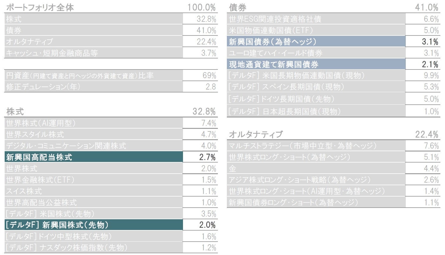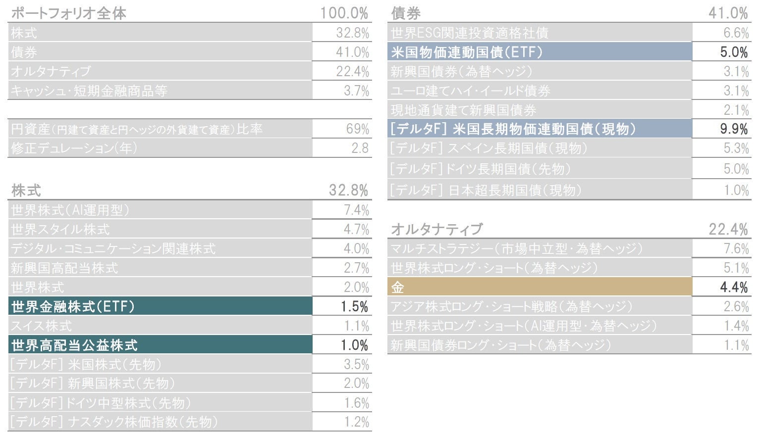 2025年8月末時点のポートフォリオの構成比は、株式が32.8%、債券が41.0%、オルタナティブが22.4%、キャッシュ・短期金融商品等が3.7%となっています(図表3)。