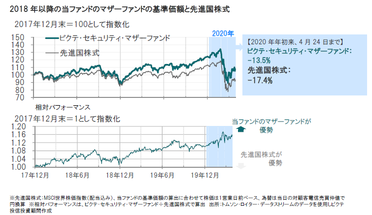 2020年2月半ば以降、新型コロナウイルスの感染が世界的な大流行(パンデミック)となる中で、世界の株式市場は大きく変動しました。当ファンドが投資を行うセキュリティ関連企業の株式についても、こうした流れとは無関係ではいられず、当ファンドのマザーファンドの基準価額は2020年年初来、足元(4月24日)までで、-13.5%の下落となりました。一方、先進国株式の平均(円換算ベース)は、-17.4%の下落であり、当ファンドのマザーファンドの基準価額は、市場平均に比べると下落幅は抑えられました。