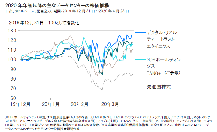その代表的なのものにはデータセンター運営企業の株式があります。新型コロナウイルスが世界的な感染拡大をみせる中で、都市の封鎖や、人の移動制限などの措置が各国・地域でとられるようになりました。世界的に多くの企業では、従業員の在宅勤務(テレワーク)が求められ、各人がインターネットを介してオンラインで業務や会議を行う機会が飛躍的に拡大しています。また、消費者としては、ネット通販のなどの利用が推奨されたり、また、在宅時間が長くなり、ネット配信動画サービスや、オンライン・コミュニケーションツールなどを利用する機会も増えています。