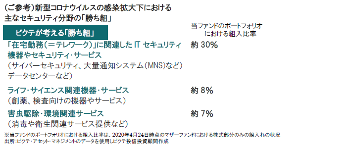 2020年年初来、世界の株式市場が大きく変動し、多くの銘柄が下落する中、当ファンドが投資を行うセキュリティ関連の分野の中では、株価が堅調に推移した銘柄群もありました。