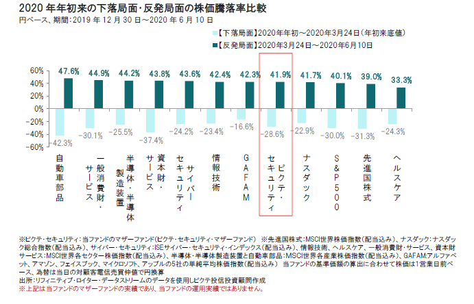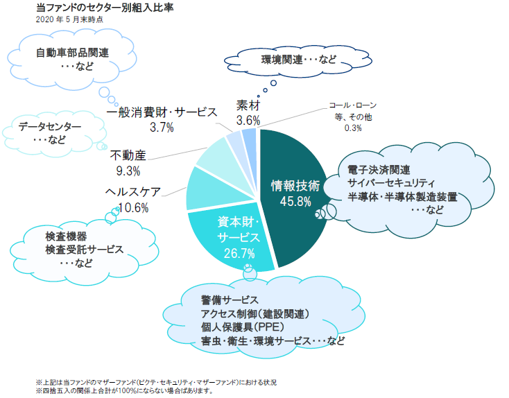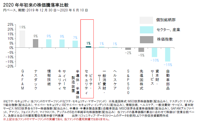 2020年年初来足元(6月10日)までの当ファンドのマザーファンドのパフォーマンスは、先進国株式を上回ってプラスとなりましたが、ハイテク関連銘柄などに比べると上昇率は小幅に留まっています。しかし、当ファンドでは、長期的・持続的に成長が期待される幅広い分野のセキュリティ関連株式へ投資を行っており、中長期的にみれば相対的に安定した成長が期待できると考えています。