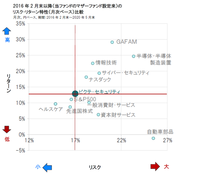 当ファンドのマザーファンドの設定来(2016年2月末)以降のリスク・リターン特性(月次ベース)をみると、当ファンドのマザーファンドは「セキュリティ」というテーマに絞った投資でありながらも、相対的にリスクを抑制しつつ、先進国株式を上回る良好なリターン実績を示しています。
