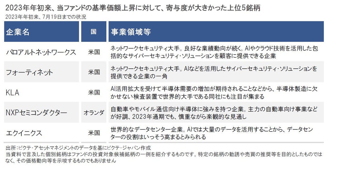 特に、足元ではAI(人工知能)への注目が集まる中で、AI関連の超大型テクノロジー企業の株価を中心に、株式市場は大きく上昇しました。当ファンドの投資先企業でも、AIの活用拡大で需要の拡大や重要性が増すとみられる、サイバーセキュリティ、半導体関連、データセンターなどの分野で活躍する企業の株価が相対的に大きく上昇し、基準価額上昇をけん引しました。