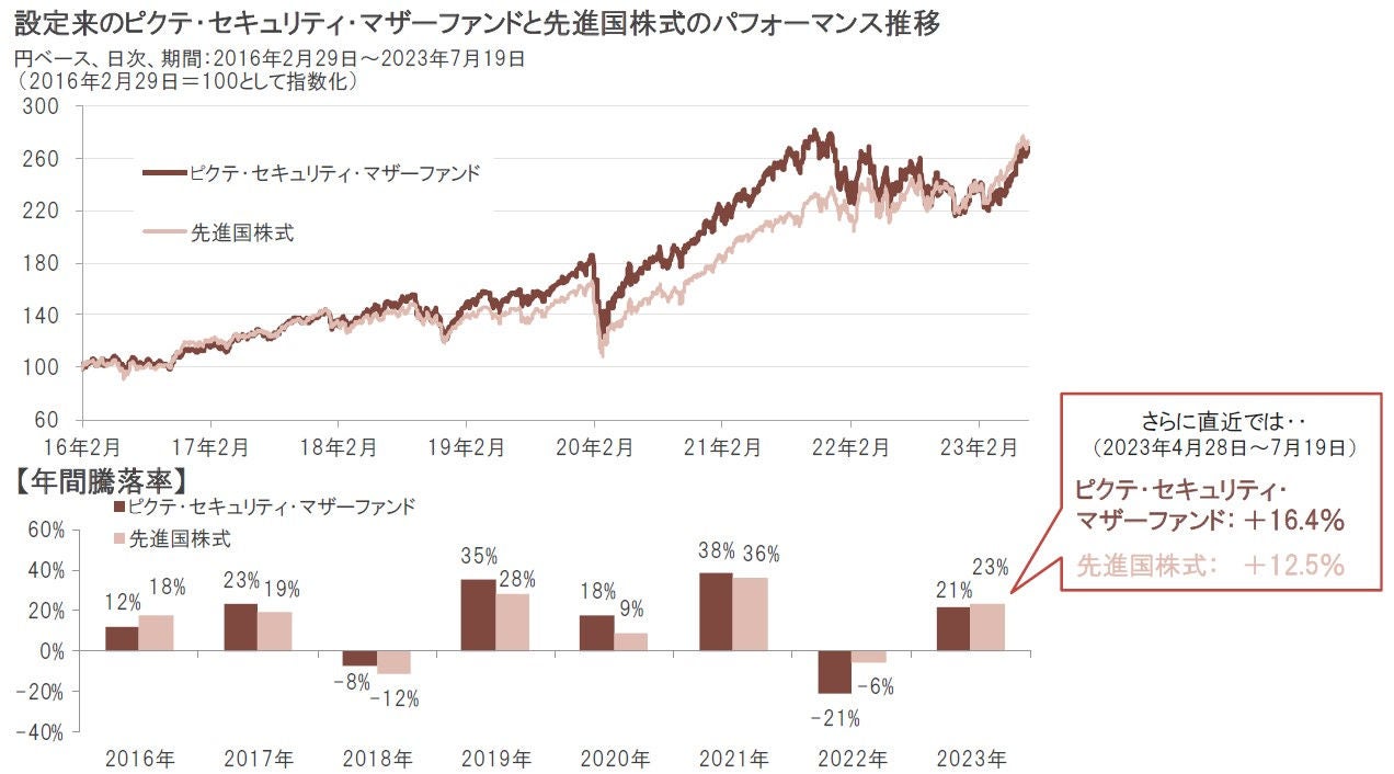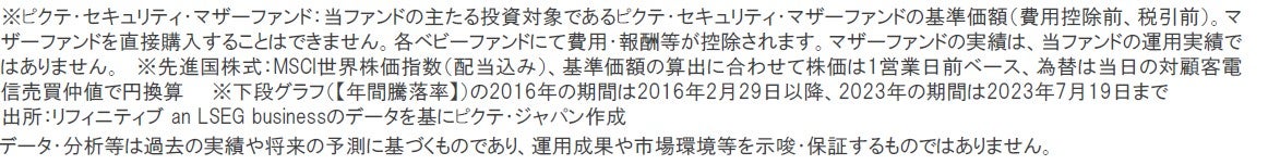 当ファンドのマザーファンドであるピクテ・セキュリティ・マザーファンドの設定来(設定日2016年2月29日)基準価額は、2021年までは概ね先進国株式を上回る上昇基調が続いてきましたが、昨年2022年は年間で先進国株式に比べて下落率が大きくなりました。