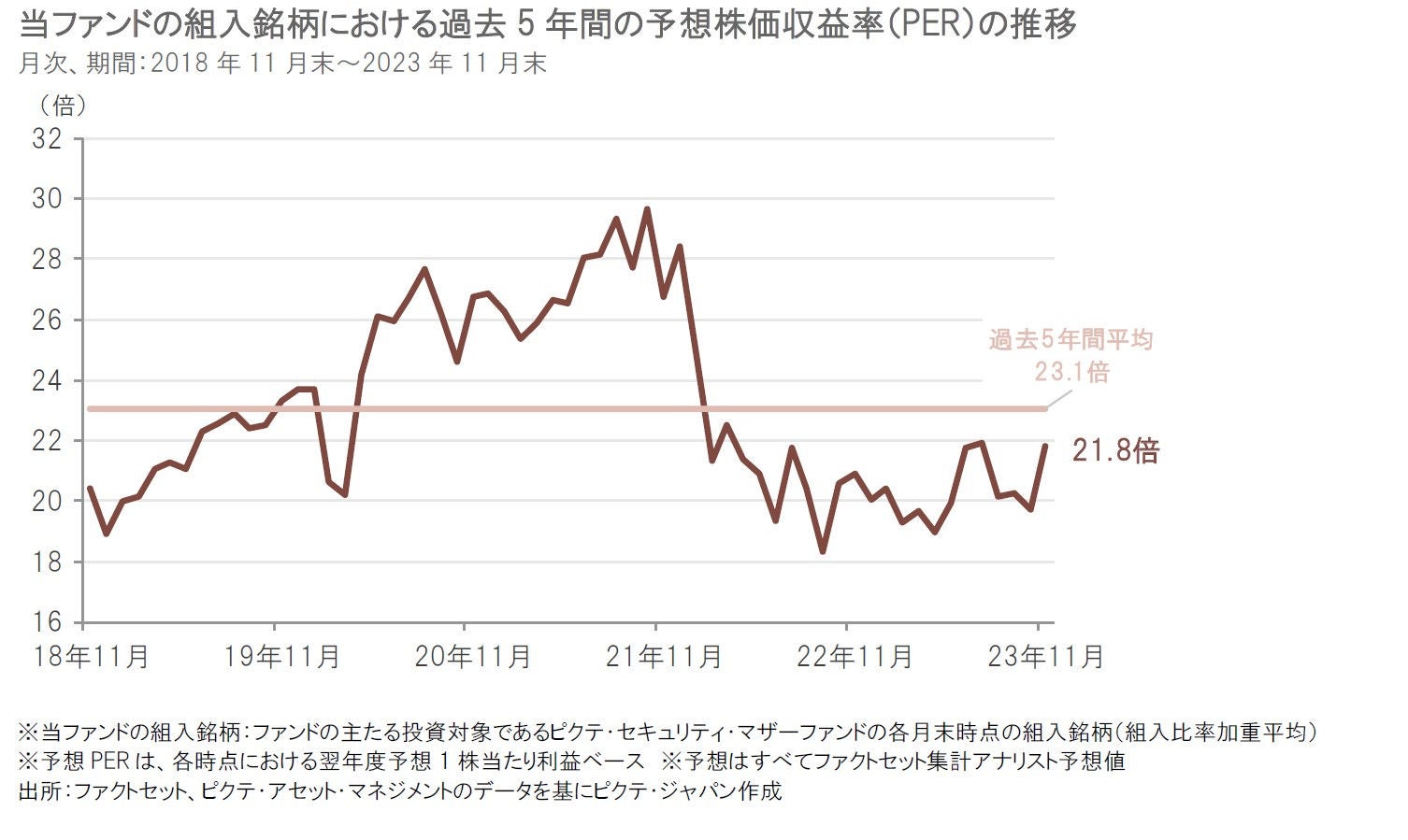 一方で、足元のバリュエーション(投資価値評価)水準は、当ファンドの組入銘柄における予想株価収益率(PER)でみると過去5年間の平均を下回る水準にあります。