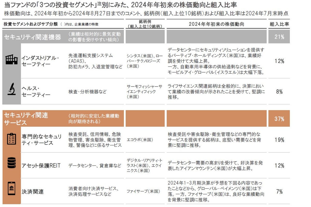 当ファンドの組入銘柄の株価動向については、個別要因で下落した銘柄もありましたが、「3つの投資セグメント」注別に2024年年初来のパフォーマンスへの寄与度をみると、「セキュリティ関連機器」、「セキュリティ関連サービス」、「ITセキュリティ製品」のいずれもプラス寄与となりました。