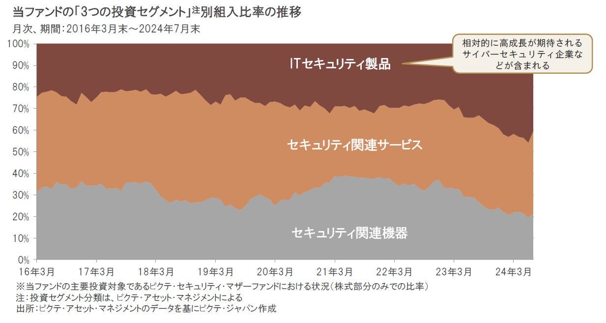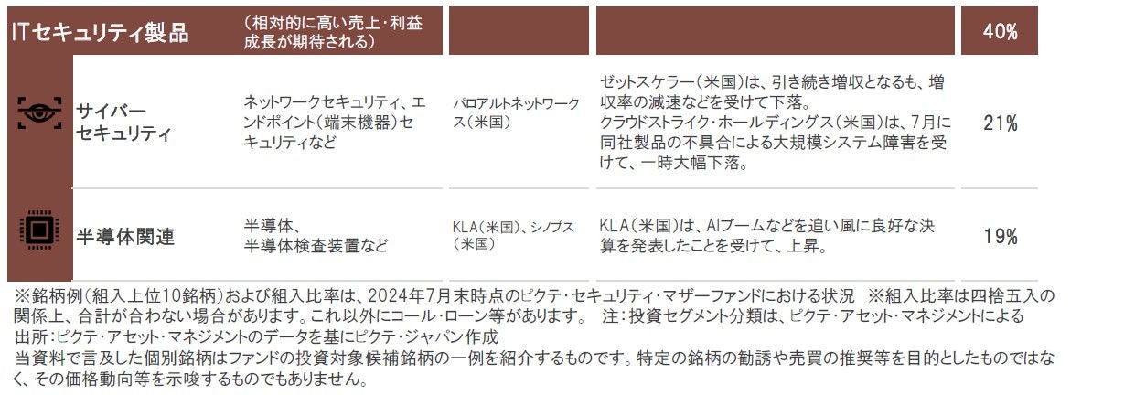 運用に際しては引き続き、幅広い分野における「セキュリティ」に関する長期的なトレンドを考慮し、良好なファンダメンタルズ(基礎的条件)を有するセキュリティ関連企業を十分に選別した上で、分散投資を行っていく方針です。足元では、中長期的に成長が期待できるサイバーセキュリティや半導体関連などを含む「ITセキュリティ製品」の組入比率を相対的に高位としています(ただし、直近ではネガティブなニュースフローも多くなっていることなどを考慮し、2024年7月末には「ITセキュリティ製品」の組入比率を6月末に比べてやや引き下げました)。