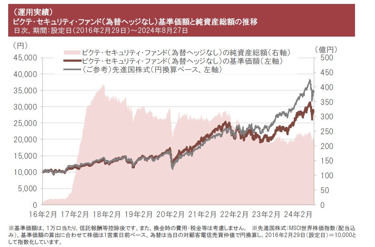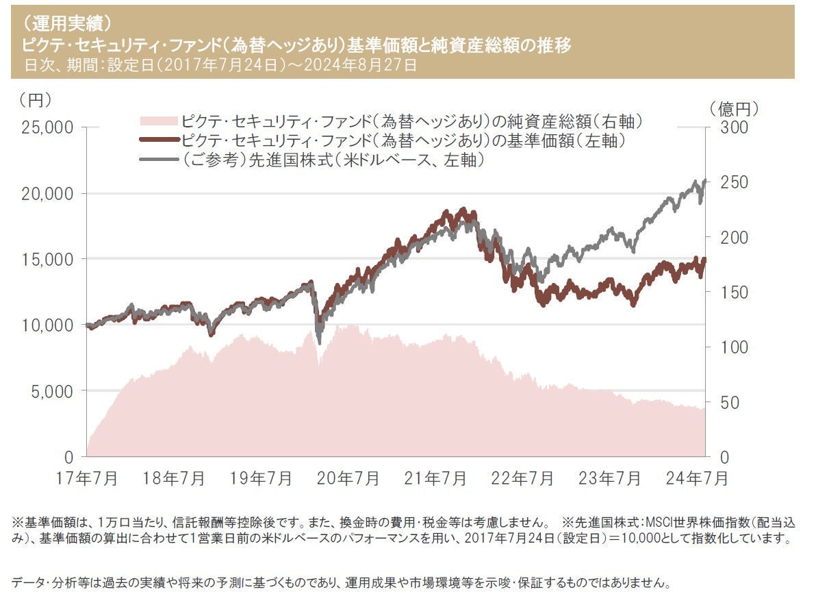 ピクテ・セキュリティ・ファンド(為替ヘッジあり)の基準価額は、2024年年初から8月27日までで+8%の上昇となりました。