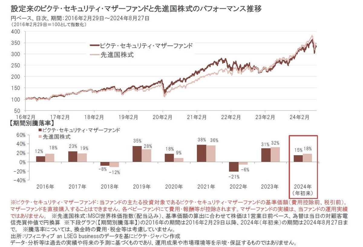 ●ピクテ・セキュリティ・ファンド(為替ヘッジあり)の基準価額は、2024年年初から8月27日までで+8%の上昇、ピクテ・セキュリティ・ファンド(為替ヘッジなし)の基準価額は2024年年初から8月27日までで+14%の上昇